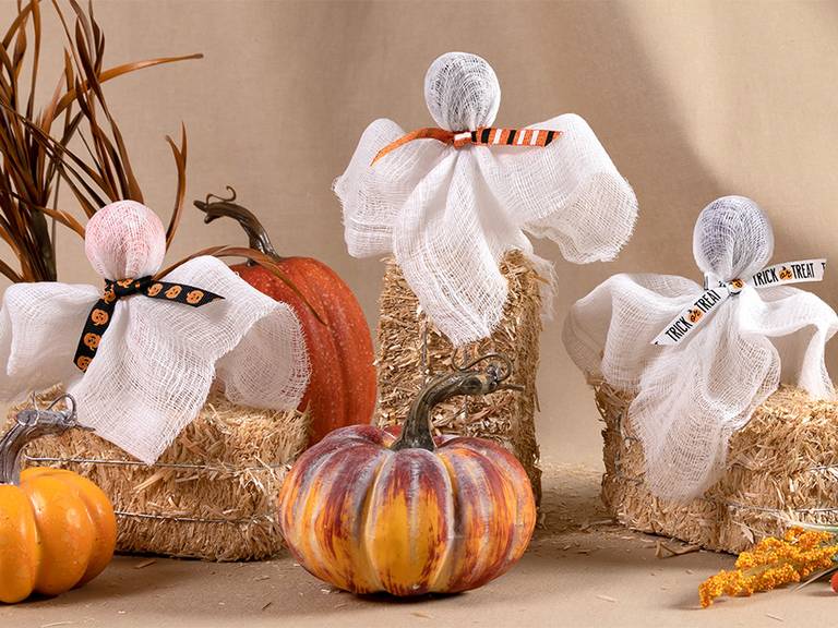 8. Gather cheesecloth around neck of ghost. Tie ribbon in knot at neck. Trim ends as needed.