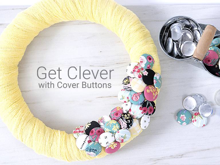 Hello, summer! Hello, any season! Personalize your front door with a wreath that speaks to any holiday or time of year. That’s the beauty of crafting with cover buttons, the look of your final project is determined by the print or theme of the fabric on your buttons.
