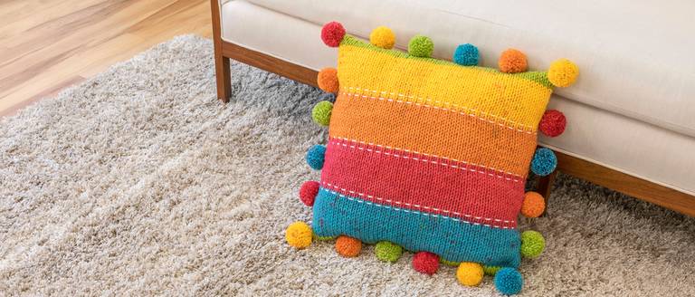 This pillow is a great learn-to-knit project. Stitched in stockinette stitch with fun pompoms all around, this pillow is perfect for any décor and skill level. Make it in any size but we love this big floor pillow size.