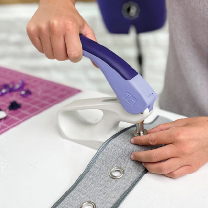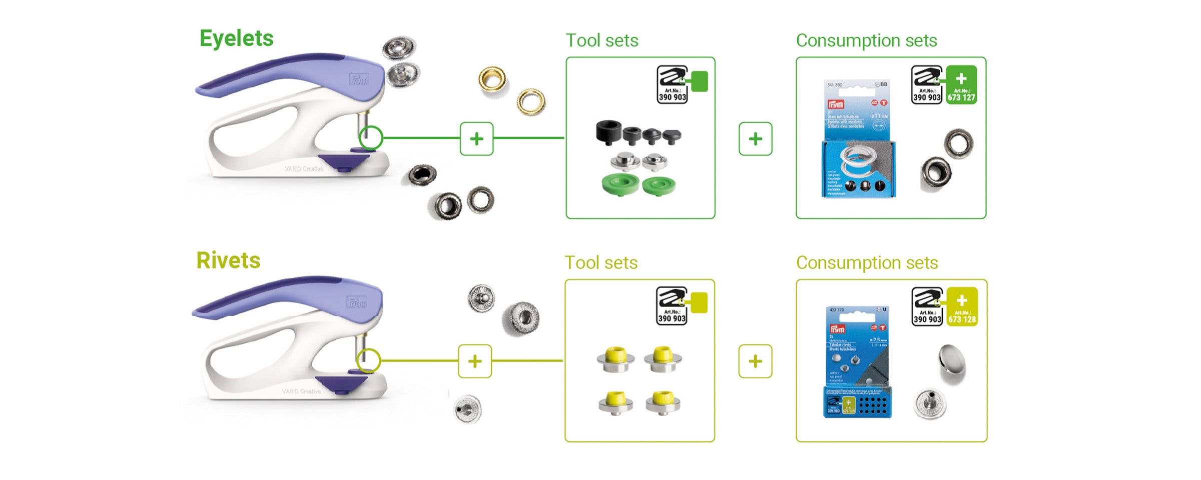 Prym offers the corresponding tool sets and consumables for applying eyelets and hollow rivets. To ensure successful use, the tools are color-coded to match the respective consumables and are also engraved. Snap tool sets & accessories coming soon!